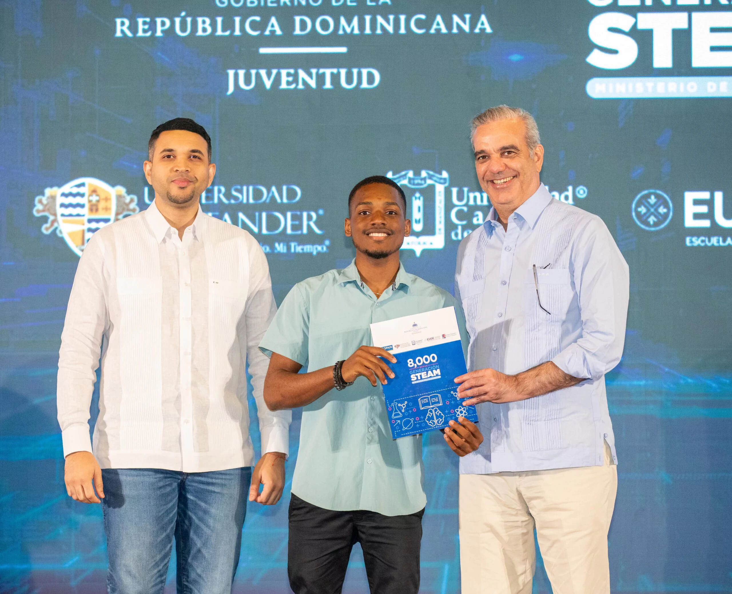Santo Domingo.- El presidente Luis Abinader entregó este sábado 8,000 becas del programa Generación STEAM, una iniciativa del Ministerio de la Juventud orientada a fortalecer la formación de jóvenes dominicanos en áreas de ciencia, tecnología, ingeniería, artes y matemáticas.