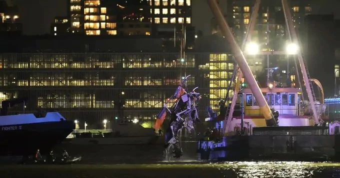 El equipo de buceadores de emergencias sigue trabajando en la recolección de piezas del helicóptero que cayeron al río, «incluyendo el rotor principal, la transmisión principal, la estructura de cubierta y la estructura de la cola», dijo la responsable.