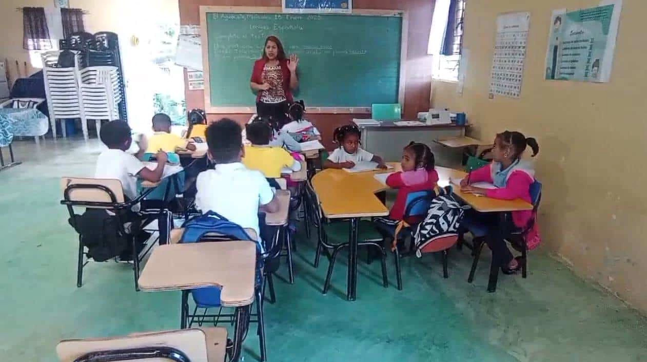 En la comunidad de El Aguacate, perteneciente al distrito municipal San Francisco de Jacagua, en Santiago, los estudiantes de la Escuela Angelita Suárez, del distrito educativo 08-06, asisten a clases en un reducido espacio dentro de una iglesia. Esto se debe a la falta de una infraestructura escolar tras la demolición del edificio anterior, que aún no ha sido reemplazado pese a las promesas de construir uno nuevo.