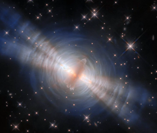 "Los haces gemelos de la estrella moribunda iluminan lóbulos polares de rápido movimiento que atraviesan una serie más lenta y antigua de arcos concéntricos. Sus formas y movimientos sugieren interacciones gravitacionales con una o más estrellas compañeras ocultas", explica la NASA