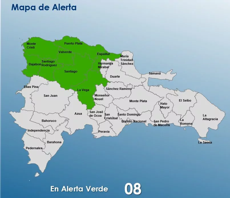 En virtud de lo anterior y lo establecido en el artículo 2, capítulo 1 de la Ley 147-02 sobre Gestión de Riesgos, este Centro de Operaciones de Emergencias (COE) amplía el nivel de alerta verde por posibles inundaciones urbanas o repentinas para las siguientes provincias: