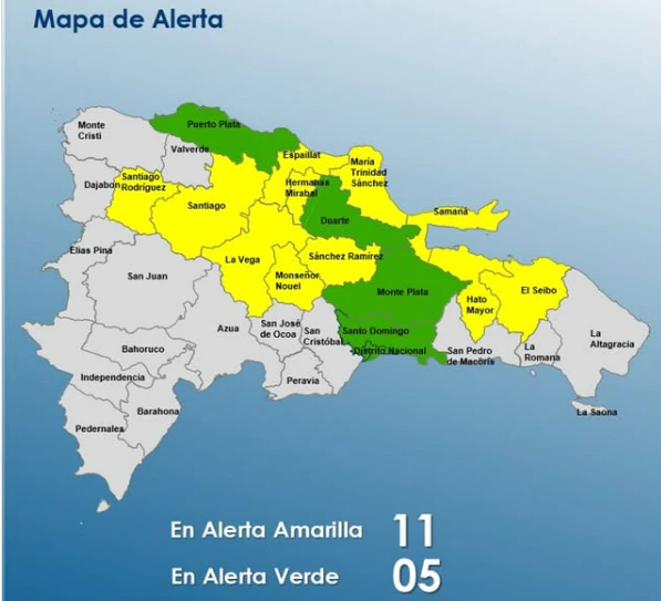 Las provincias que el COE ha puesto en alerta amarilla son: Samaná, María Trinidad Sánchez, Santiago Rodríguez, Hato Mayor, Monseñor Nouel, Sánchez Ramírez, El Seibo, La Vega, Hermanas Mirabal, Santiago, Espaillat.