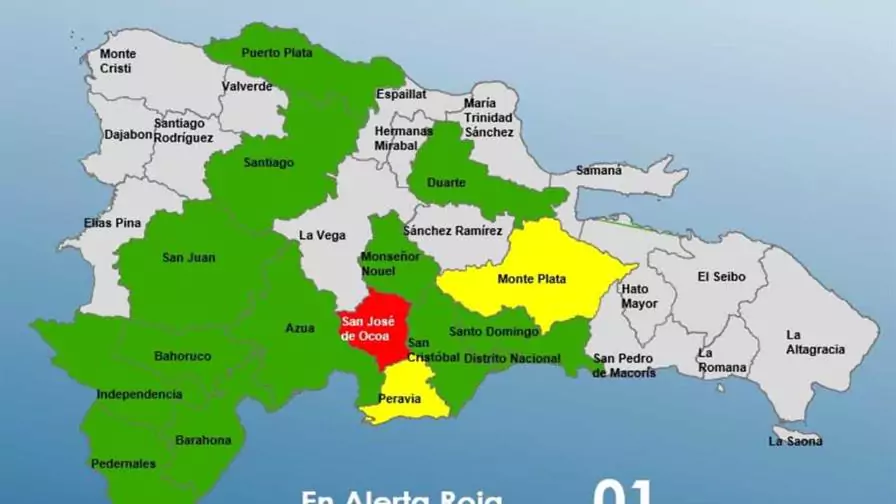 En alerta amarilla se encuentran Monte Plata y Peravia, mientras que 13 provincias permanecen en verde: Monseñor Nouel, Independencia, Puerto Plata, San Cristóbal, Azua, Duarte, Bahoruco, Santiago, Barahona, Santo Domingo, San Juan, Pedernales y el Distrito Nacional.