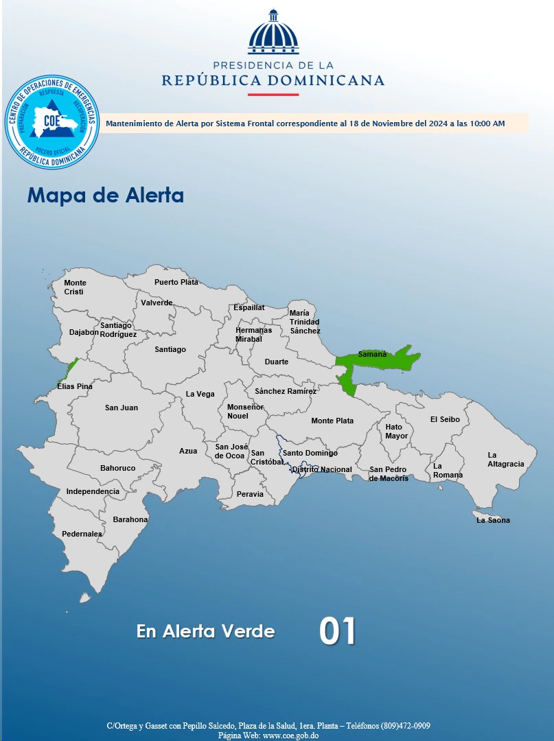 La Dirección del Centro de Operaciones de Emergencias (COE) descontinuó los niveles de alerta meteorológica para casi todo el territorio nacional; solo Samaná (en especial Punta Balandrita) se mantiene en verde.