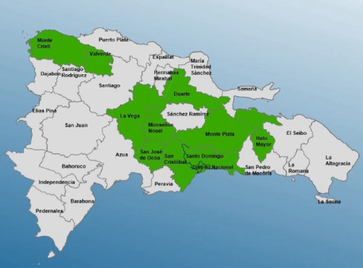 Las provincias en alerta verde son: San Cristóbal, Monseñor Nouel, Monte Plata, San José de Ocoa, Montecristi, Distrito Nacional, Valverde, Hato Mayor, Duarte (especialmente el Bajo Yuna), La Vega y Santo Domingo.