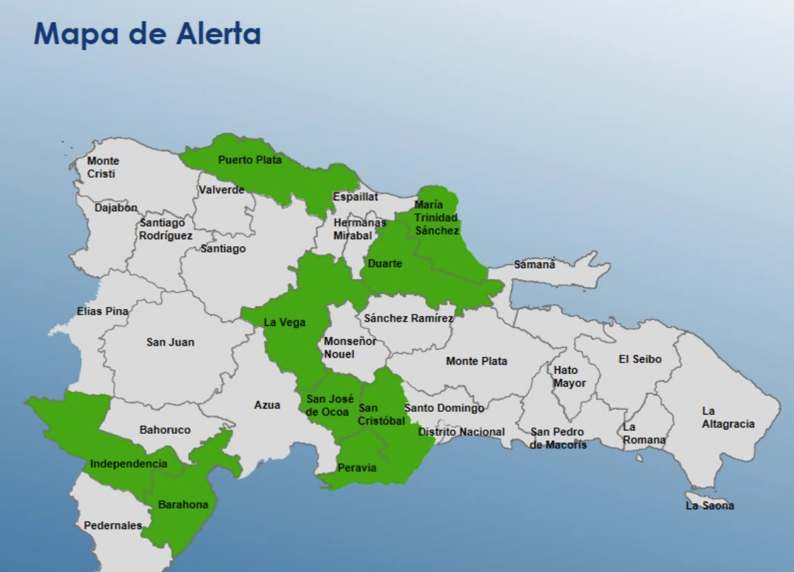 Según explicó el COE, las provincias que continúan bajo alerta verde son Peravia, San José de Ocoa, La Vega, Independencia, San Cristóbal, Barahona, María Trinidad Sánchez, Duarte (en especial el Bajo Yuna) y Puerto Plata.