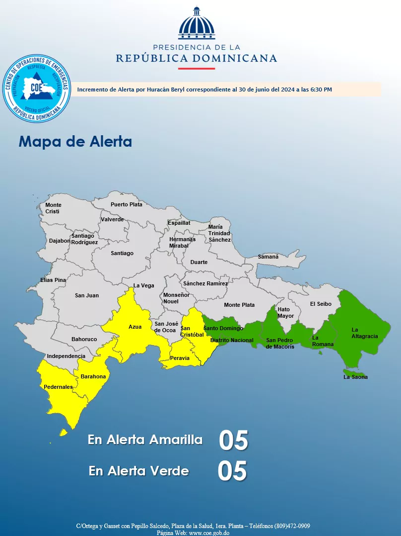 "La Dirección del Centro de Operaciones de Emergencias (COE), informa que de acuerdo al boletín meteorológico del día de hoy, de la Oficina Nacional de Meteorología “ONAMET, el cual establece que las 4:00 pm, el huracán Beryl se ubicó cerca de la latitud 11.0 norte y longitud 56.1 oeste, esto es a unos 440 km al este/sureste de Barbados, a unos 1550 km de La Isla Saona y a unos 1700 km al sureste de Punta Palenque, San Cristóbal. Beryl mantiene su movimiento hacia el oeste a unos 33 kph, esperándose que siga en los próximos días moviéndose hacia el oeste u oeste/noroeste", describe el COE.
