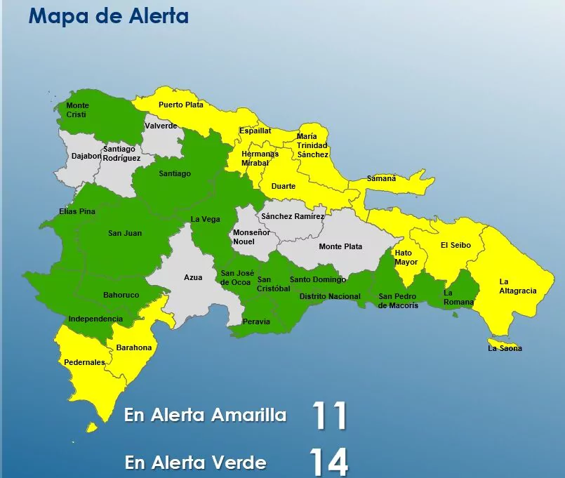 Por otro lado, las provincias en alerta verde son Santo Domingo, el Distrito Nacional, Santiago, La Vega, San Pedro de Macorís, San Cristóbal, San José de Ocoa, La Romana, Peravia, San Juan, Bahoruco, Independencia y Elías Piña.