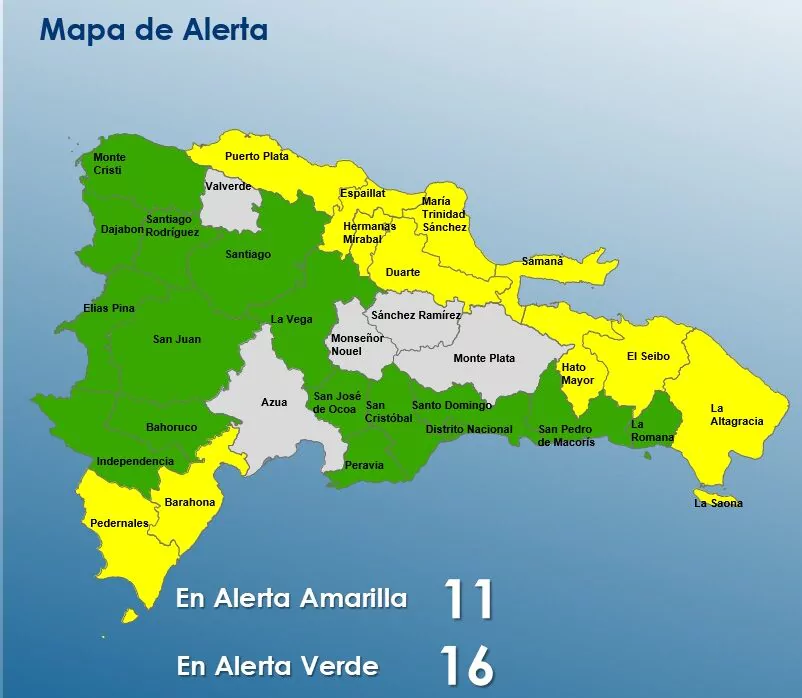 Las provincias en alerta amarilla incluyen Puerto Plata, Hato Mayor, Duarte, María Trinidad Sánchez, El Seibo, Hermanas Mirabal, Espaillat, Samaná, La Altagracia, Barahona y Pedernales.