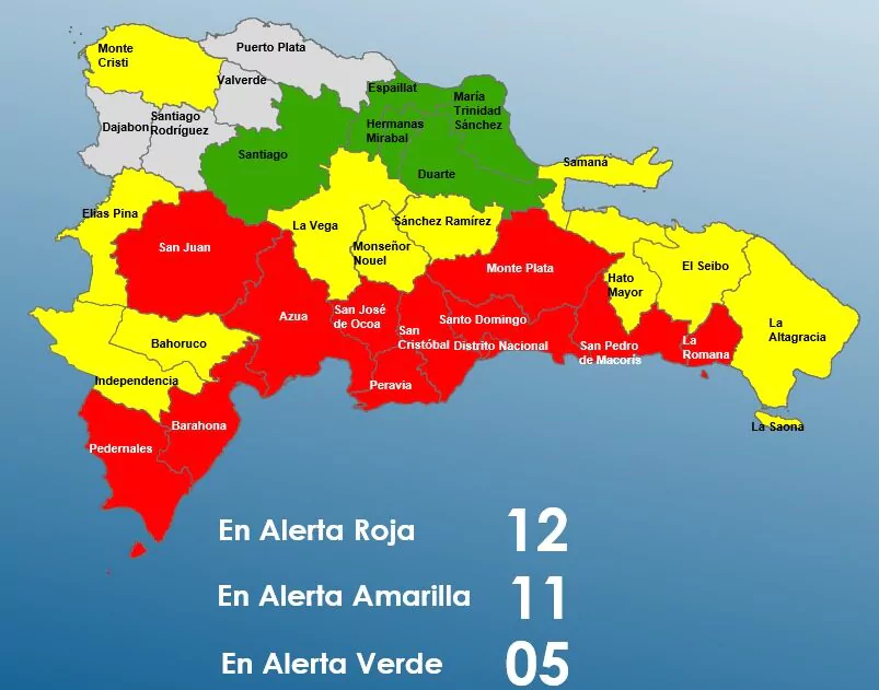El Centro de Operaciones de Emergencias (COE) mantiene este sábado 11 provincias y el Distrito Nacional en alerta roja, 11 en amarilla y aumenta a 5 las que se encuentran en verde, debido a los efectos asociados a la tormenta tropical Melissa, la número 13 de la temporada ciclónica 2025, que continúa desplazándose por el mar Caribe con potencial de convertirse en huracán.