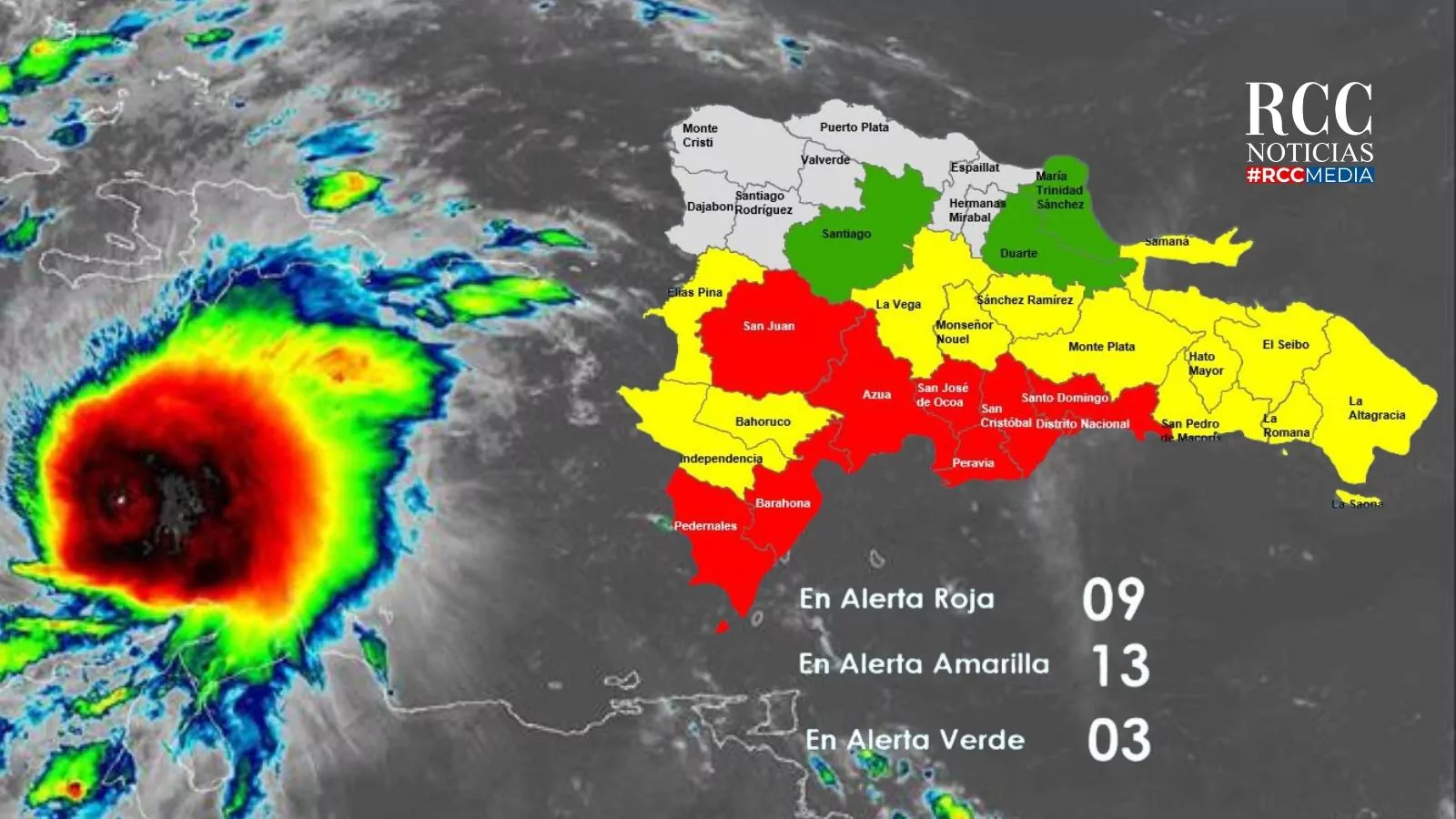El Centro de Operaciones de Emergencias (COE) informó este miércoles que mantiene ocho provincias y el Distrito Nacional en alerta roja, mientras que aumentó a 13 el número de provincias bajo alerta amarilla y mantiene tres en verde, debido a los efectos de la tormenta tropical Melissa, la número 13 de la Temporada Ciclónica 2025.