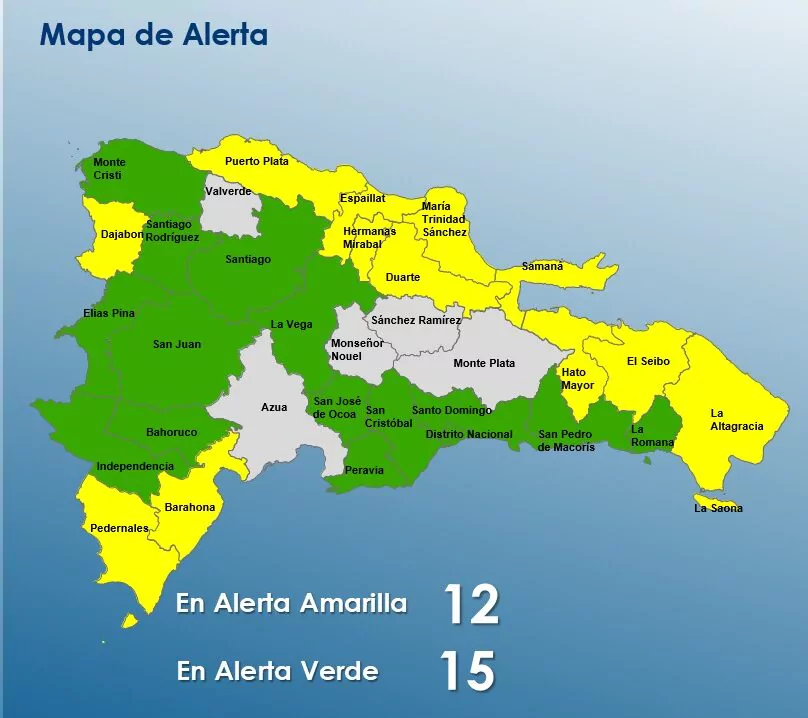 La institución emitió niveles de alerta para varias provincias del país: Puerto Plata, Hato Mayor, Duarte, María Trinidad Sánchez, El Seibo, Hermanas Mirabal, Espaillat, Samaná, La Altagracia, Barahona, Dajabón y Pedernales, para un total de 12 provincias en alerta amarilla