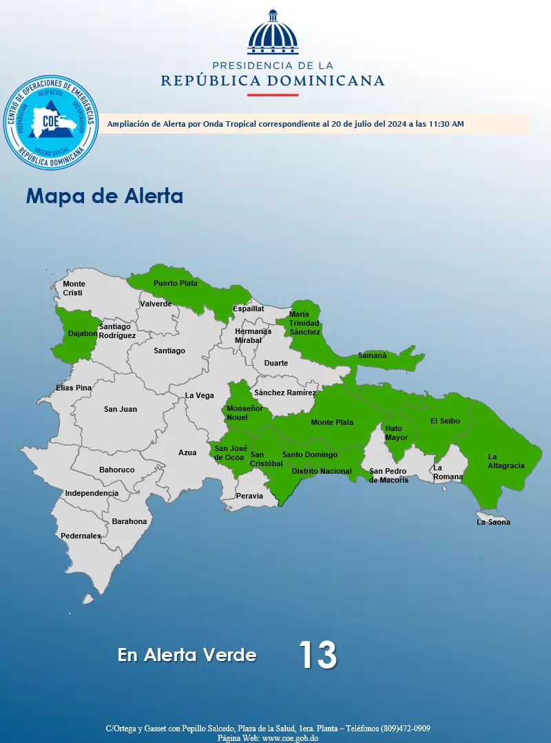Las provincias en alerta verde son: Santo Domingo junto al Distrito Nacional, San Cristóbal, La Altagracia, María Trinidad Sánchez, San José de Ocoa, Monseñor Nouel, Monte Plata, Hato Mayor, Dajabón, Puerto Plata, Samaná y El Seibo.