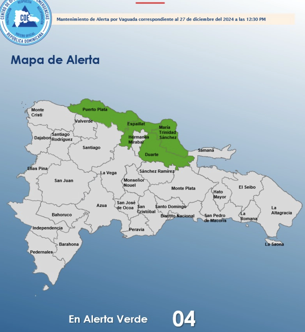 Se encuentran en alerta verde las provincias de: María Trinidad Sánchez, Espaillat, Duarte, Puerto Plata.