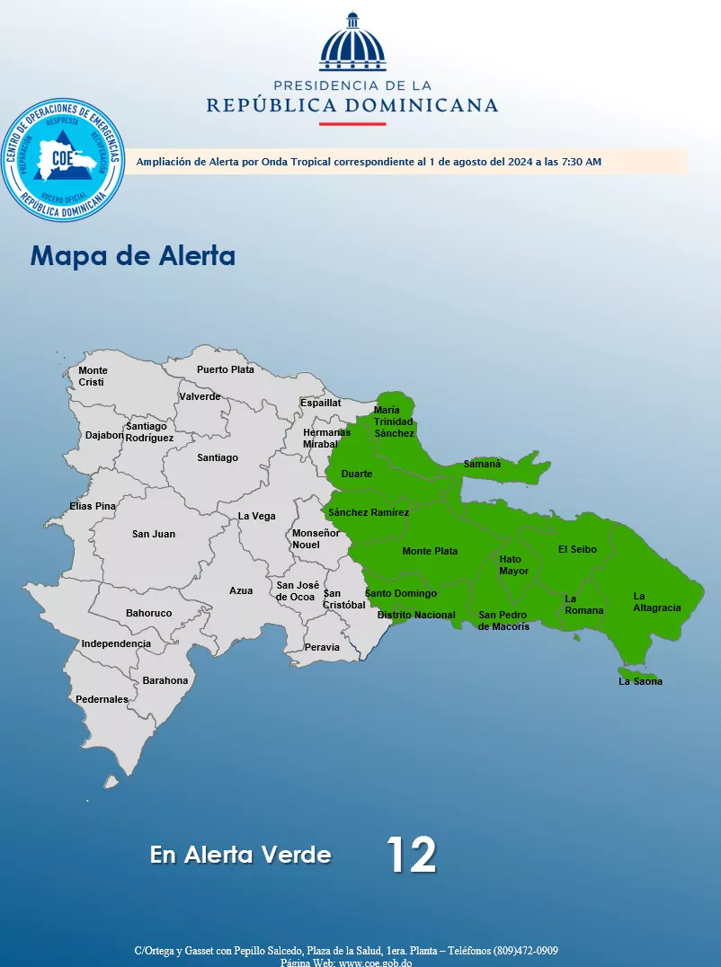 Las provincias que se encuentran en alerta son la Provincia de Santo Domingo, Distrito Nacional, María Trinidad Sánchez, San Pedro de Macorís, El Seibo, Hato Mayor, La Altagracia, La Romana, Duarte, Sánchez Ramírez, Samaná y Monte Plata.