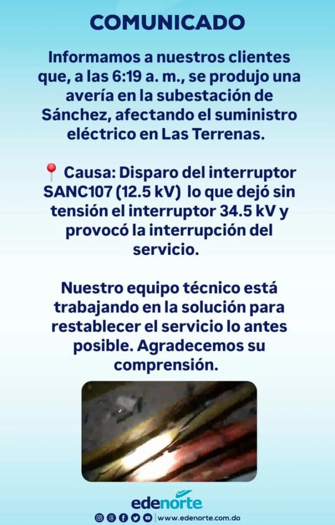 Según informó Edenorte en un comunicado, el corte se produjo a las 6:19 a.m. debido a una avería en la subestación de Sánchez.