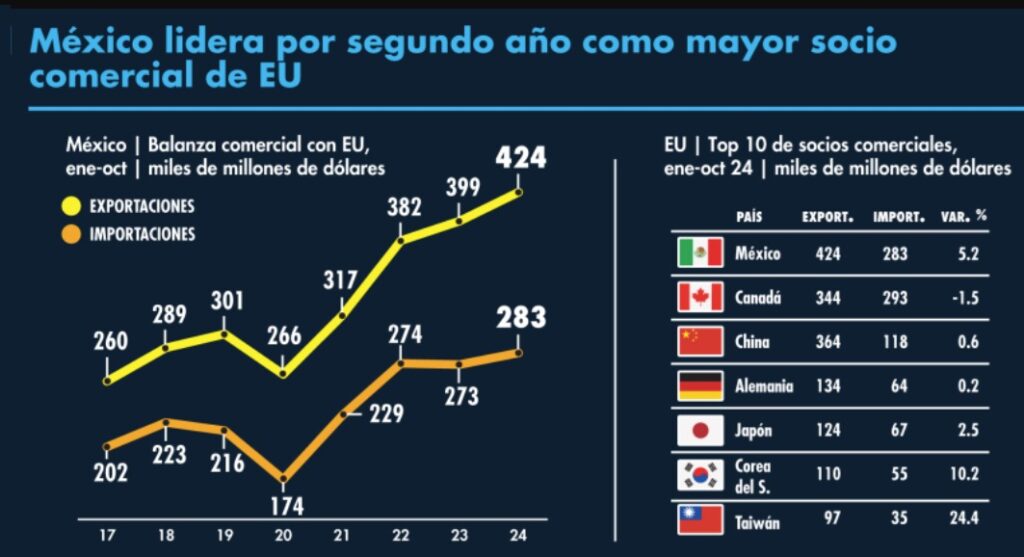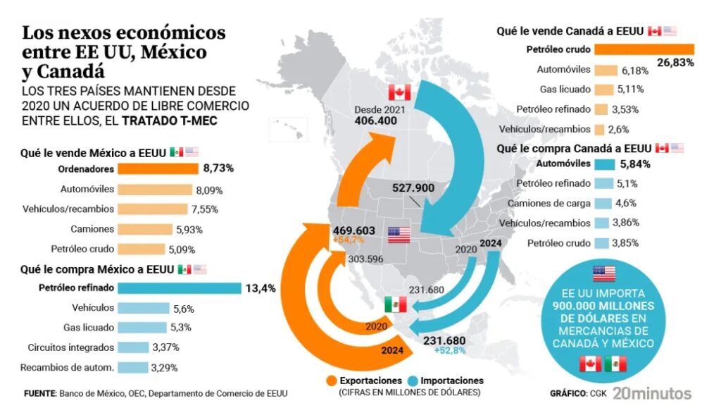 Gracias al Tratado T-MEC (firmado en 2020), las economías de los tres países están profundamente entrelazadas. En 2024, Estados Unidos importó más de 900,000 millones de dólares en mercancías de Canadá y México, superando a China como principal origen de importaciones.