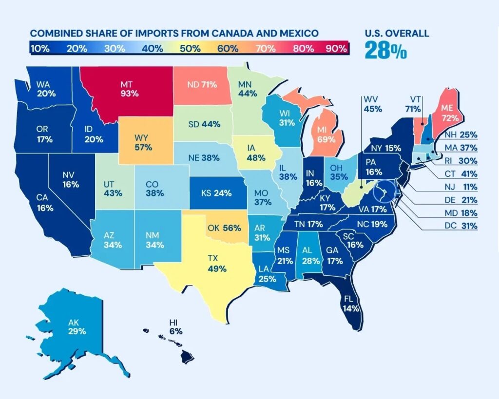Según los datos de la U.S. International Trade Administration (marzo de 2025), el 28% del total de importaciones estadounidenses provienen de Canadá y México. Sin embargo, esta cifra varía drásticamente por estado: