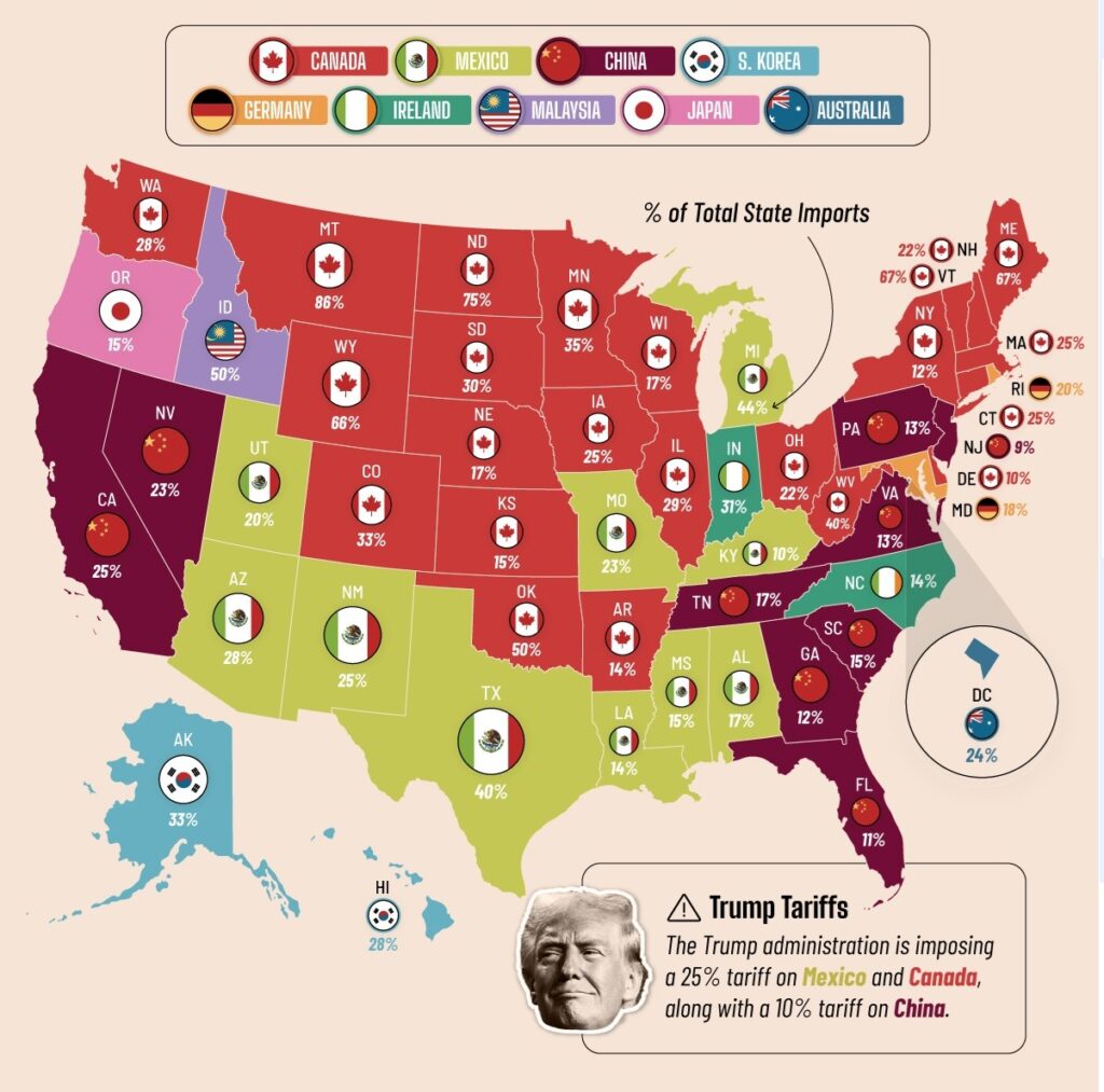 Cuando la administración Trump impuso aranceles del 25% sobre productos de México y Canadá, el golpe no solo fue diplomático, fue económico, estructural y geopolítico. Ampliando las tensiones en las relaciones diplomáticas en América del Norte y dejó expuesta una cruda realidad económica: la dependencia estructural que tienen muchos estados de EE. UU. de las importaciones de sus vecinos. Esta decisión desató una tormenta comercial que sacó a relucir la intensa dependencia que tiene Estados Unidos de sus dos vecinos norteamericanos.