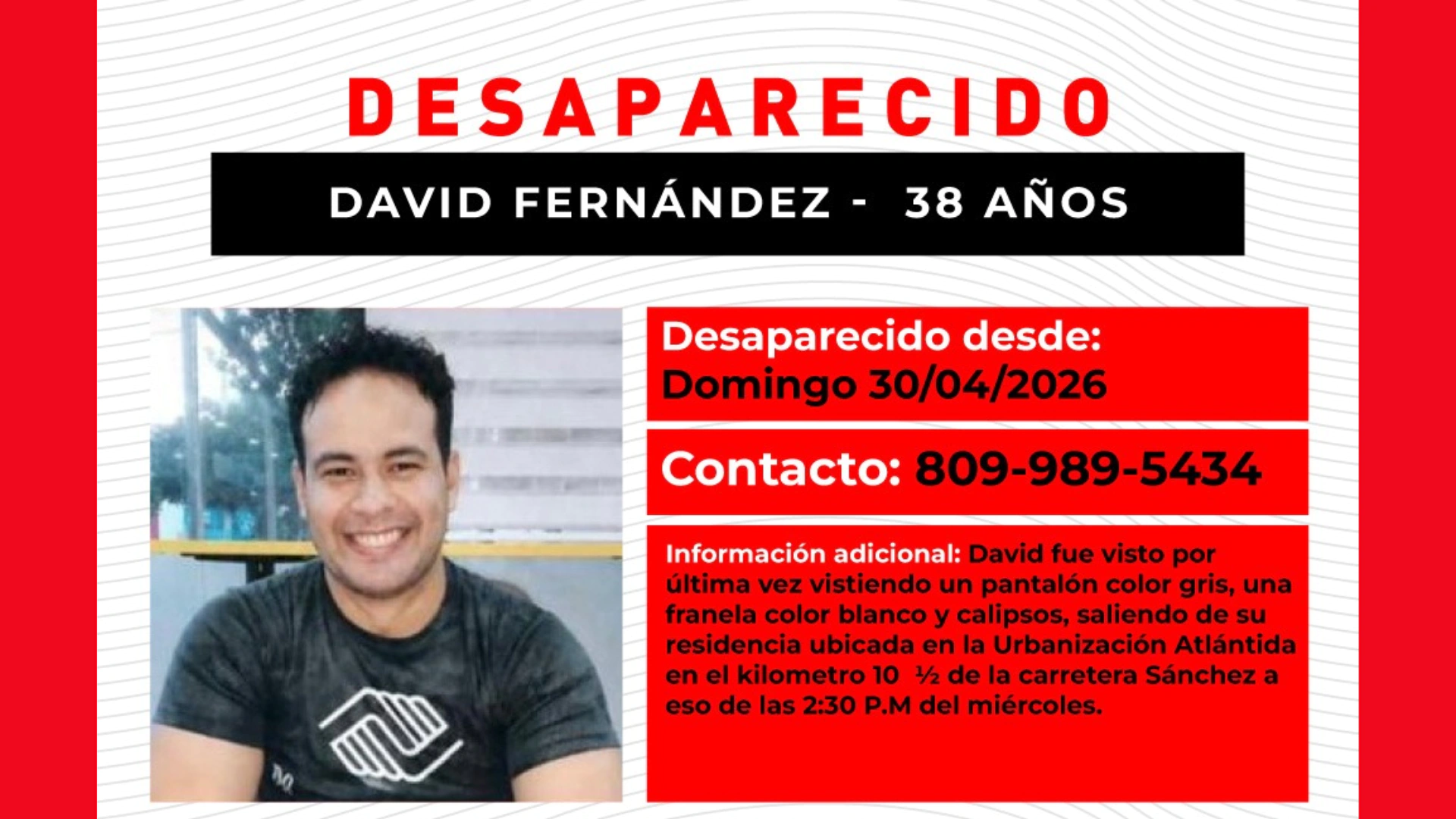 Familiares reportaron la desaparición de David Fernández, de 38 años, quien fue visto por última vez en el Distrito Nacional tras salir de su residencia ubicada en la urbanización Atlántida, en el kilómetro 10 ½ de la carretera Sánchez.