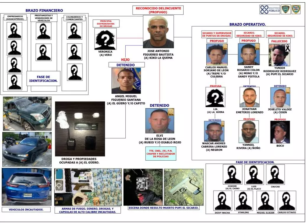 El Ministerio Público ha establecido que, De la Rosa, en su condición de teniente coronel de la Policía Nacional retirado, haciendo uso indebido de su estatus, se dedicaba a transportar al hoy prófugo Figuereo Bautista (a) Kiko La Quema, a bordo de los diferentes vehículos de la organización criminal, burlando los controles policiales, quien por su investidura transitaba libremente sin ser requisado.