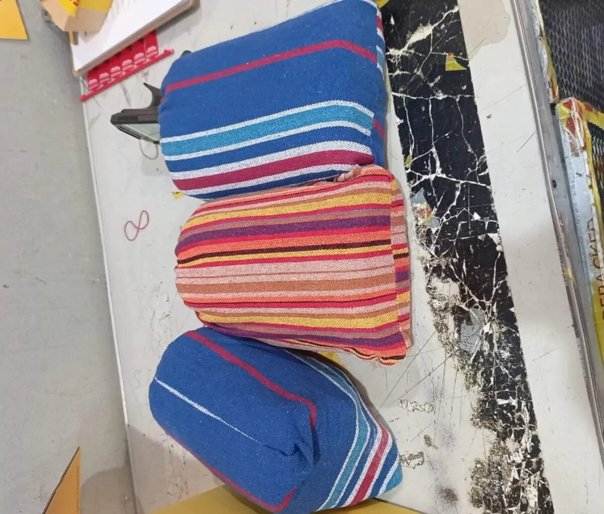 Por instrucciones del fiscal, se procedió a abrir el paquete, encontrando dentro seis hamacas de tela de distintos colores, todas empapadas de un polvo blanco que se presume es cocaína.