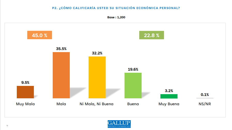 Según la encuesta realizada por #Gallup-RCC, el 45 % de los consultados considera que su situación económica es mala o muy mala, mientras que solo el 22.8 % la califica como buena o muy buena.