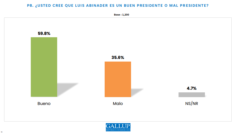 Según los resultados de la más reciente encuesta Gallup-RCC, el 59.8 % de los dominicanos considera que el presidente Luis Abinader ha sido hasta un buen mandatario, mientras que un 35.6 % lo califica de manera negativa.