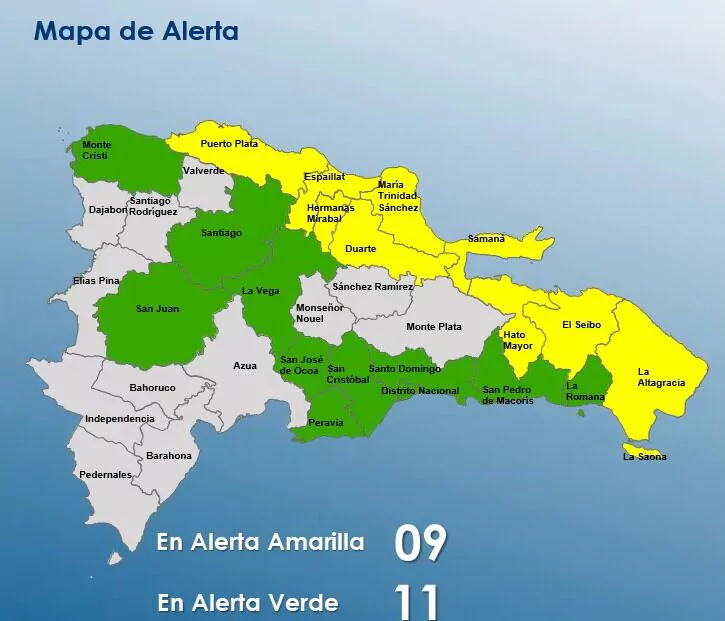 Mientras en alerta verde están Santo Domingo, Distrito Nacional, La Vega, San Cristóbal, Monte Cristi, Santiago y San Pedro de Macorís.