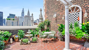 Uno de los puntos más atractivos de esta propiedad es su terraza privada de 28 metros cuadrados, con pérgola y área de estar, que ofrece una vista impresionante del horizonte de Manhattan, especialmente del vibrante Midtown. Este espacio exterior, ideal para disfrutar del paisaje urbano, se convierte en un elemento clave en la experiencia de vivir en el corazón de Nueva York.
