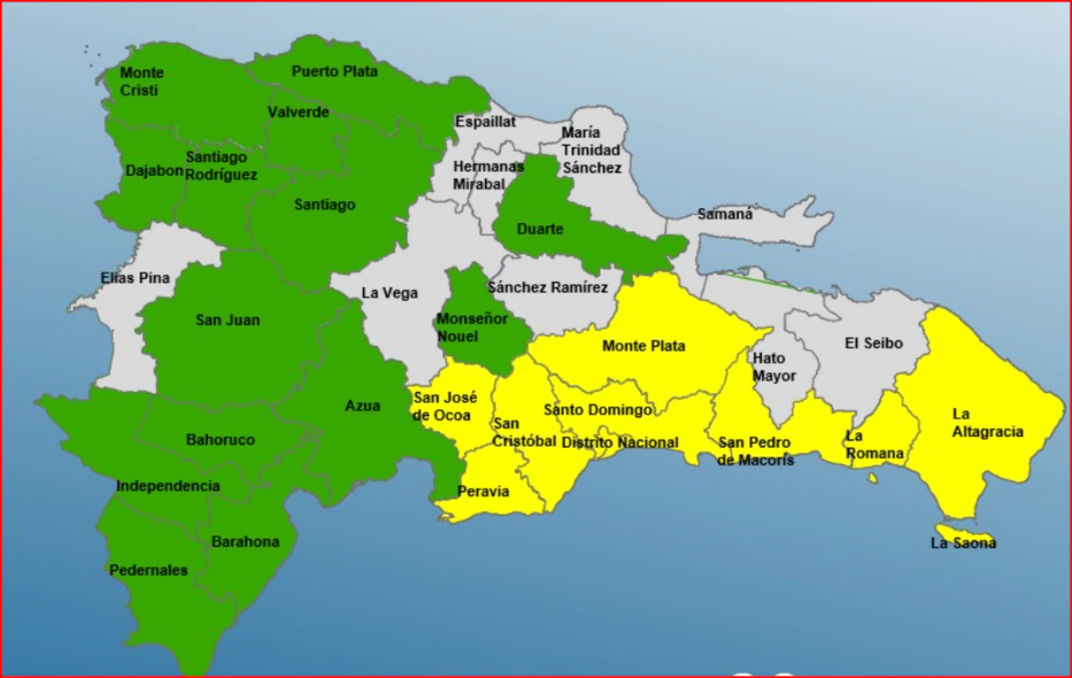 En alerta amarilla están el Distrito Nacional, Monte Plata, Peravia, La Altagracia, La Romana, San Pedro de Macorís, San Cristóbal, Santo Domingo y San José de Ocoa. Otras 14 provincias, entre ellas Santiago, Puerto Plata, Barahona y Pedernales, permanecen en alerta verde.