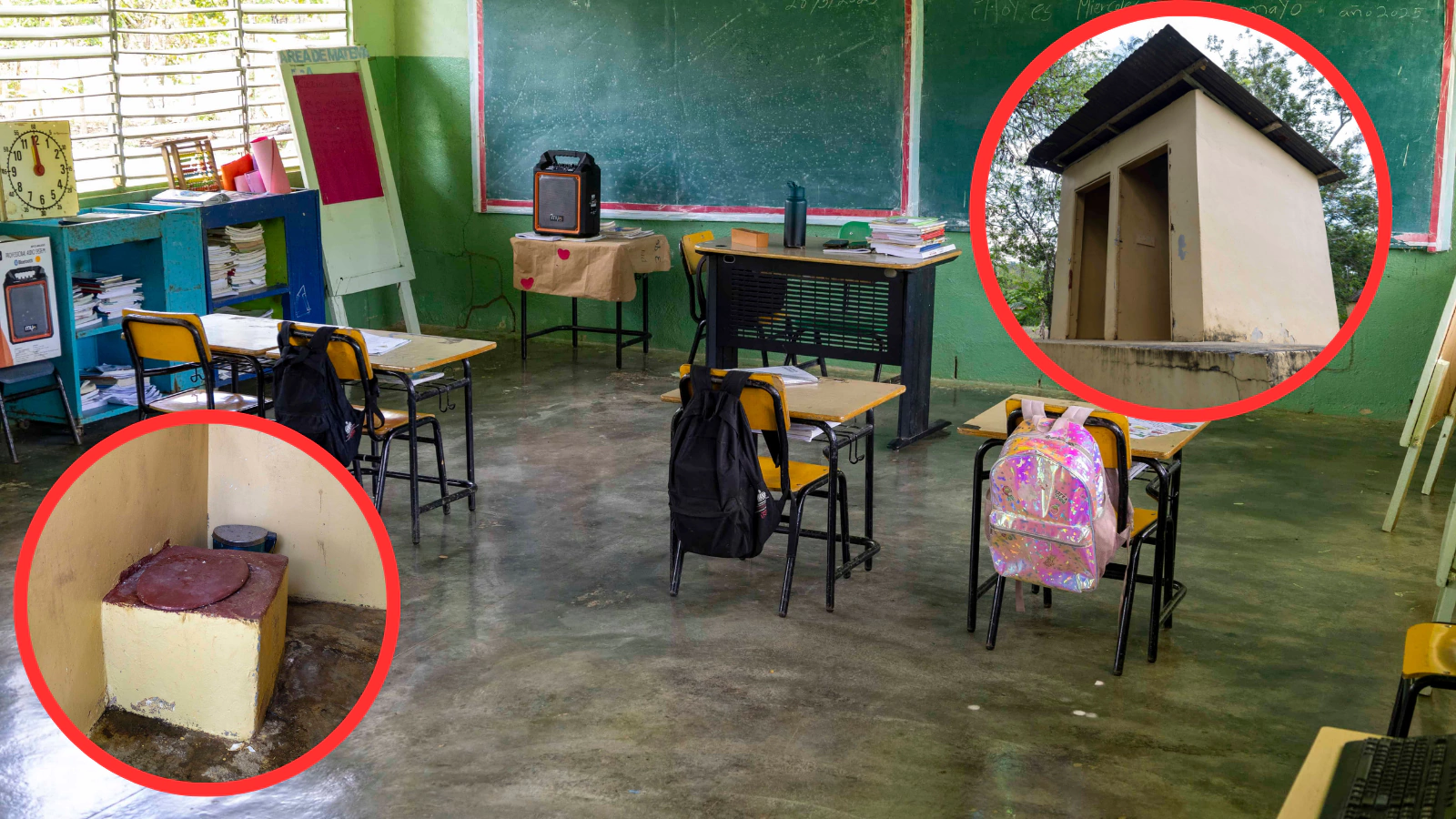 Estas estructuras son un espacio abierto entre las heces fecales, el hedor y las plagas que emanan de los pozos sépticos, y los estudiantes que reciben docencia.