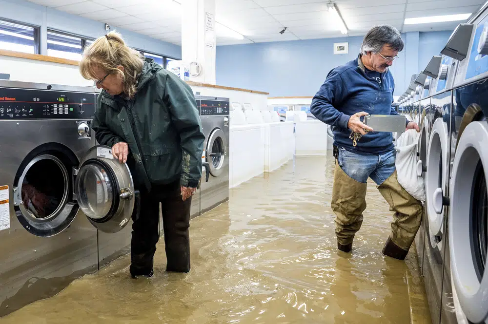 En la costa central del estado, los trabajadores transportaban camiones repletos de rocas para tapar un dique roto en un río en medio de lluvias y vientos constantes.