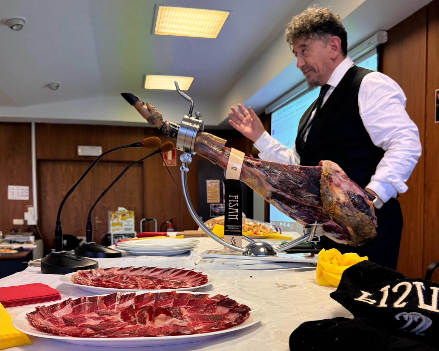 Florencio Sanchidrián, Embajador Mundial del jamón ibérico y representante de Marca España, afirmó que este alimento está “nutrido por los cuatro elementos de la vida: tierra, agua, fuego y viento”, y destacó la calidad del producto presentado: un jamón de Guijuelo, curado durante cinco años a más de 900 metros de altitud.