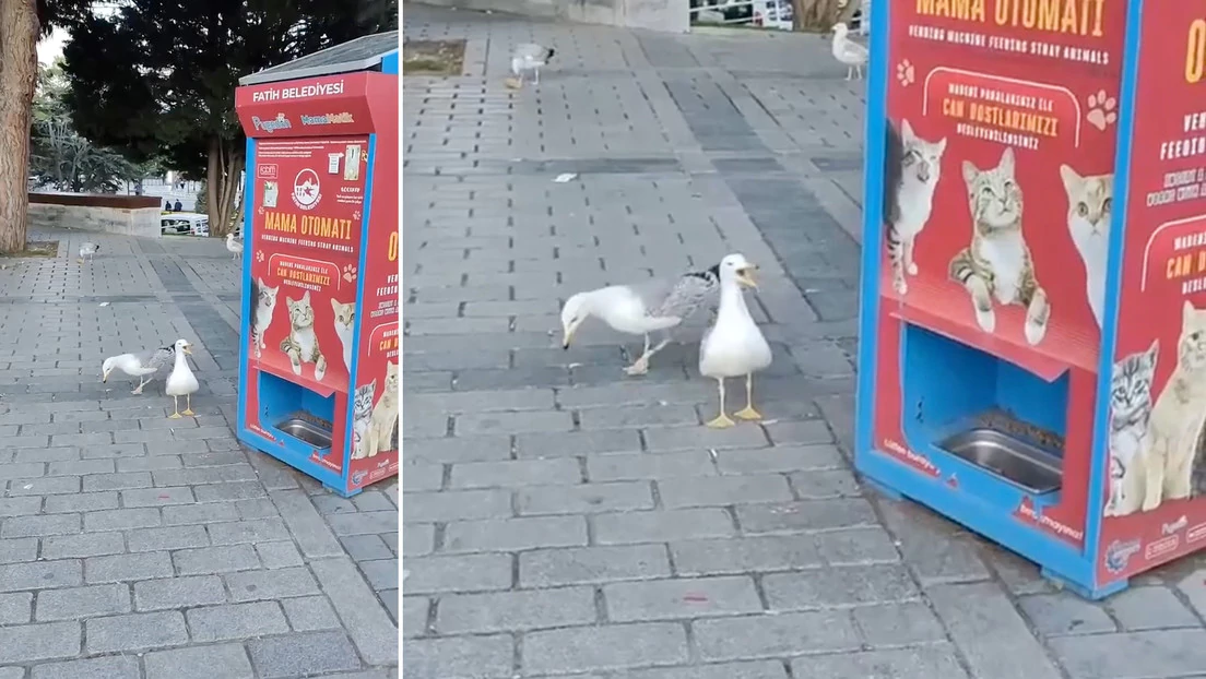 En la ciudad turca de Estambul, una gaviota ha dominado el lenguaje gatuno para conseguir comida de una máquina expendedora.