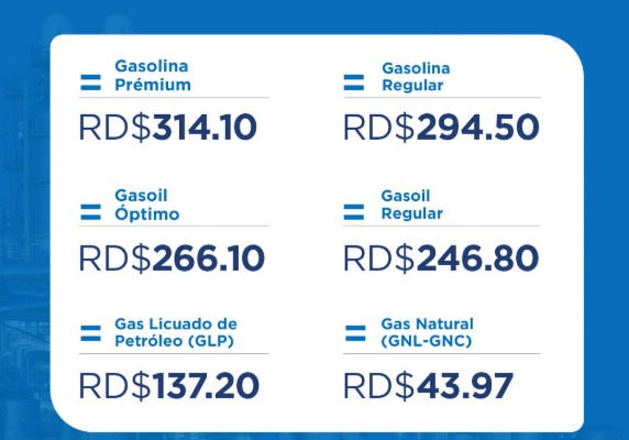 El subsidio por tipo de combustible asciende a RD$104.8 millones para el GLP; RD$415.2 millones al gasoil regular; RD$263.2 millones en gasoil óptimo; RD$233.9 millones a gasolina premium y RD$136.6 millones a la gasolina regular.