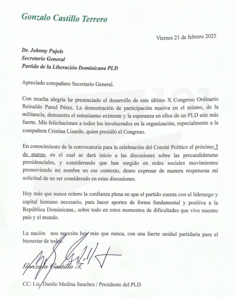 Castillo Terrero hizo pública su decisión a través de una comunicación dirigida al secretario general del PLD, Jhonny Pujols , en la que solicita la exclusión de su nombre de las discusiones sobre las precandidaturas presidenciales del partido.