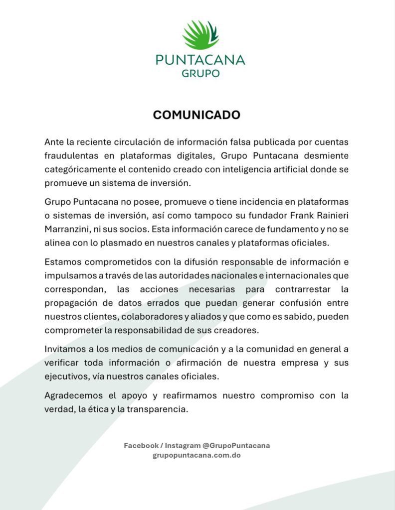 Ante la circulación de información falsa en medios digitales promoviendo un sistema de inversión vinculado al Grupo Puntacana, la empresa ha emitido un comunicado desmintiendo "categóricamente" la existencia de tal plataforma.