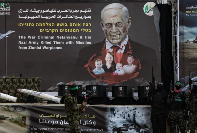 Los cuerpos fueron entregados en una ceremonia organizada por Hamás en el sur de Gaza, donde los militantes dispusieron los ataúdes sobre un escenario con un cartel que acusaba al primer ministro israelí de ser responsable de sus muertes.