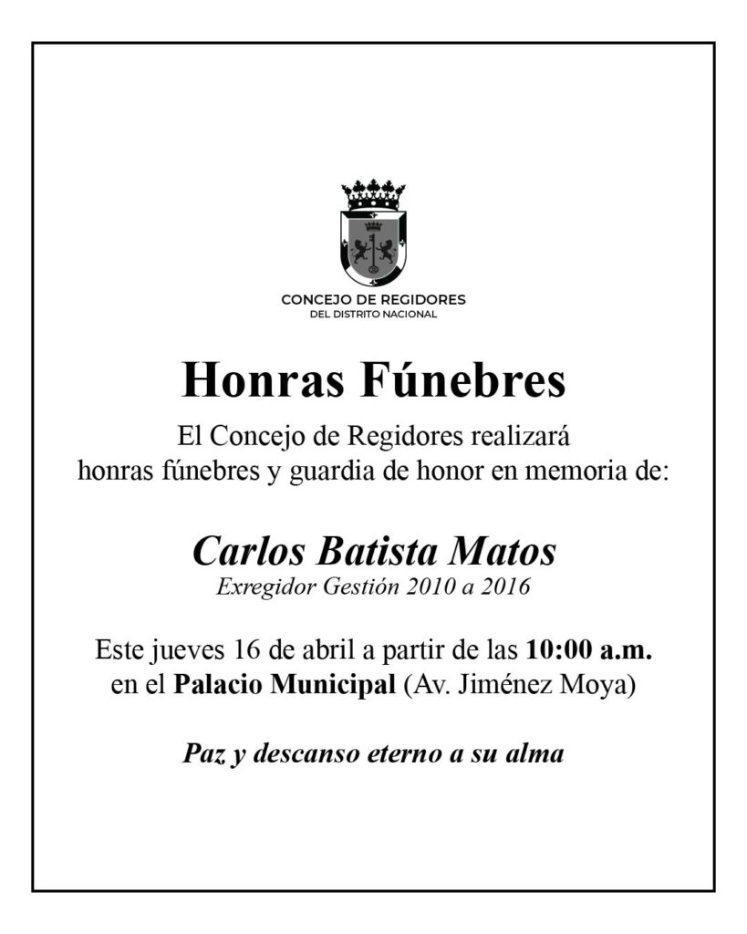 La Alcaldía del Distrito Nacional y el Concejo de Regidores rendirán honras fúnebres al comunicador Carlos Batista Matos, quien se desempeñó como regidor en esta demarcación en el periodo 2010-2016.