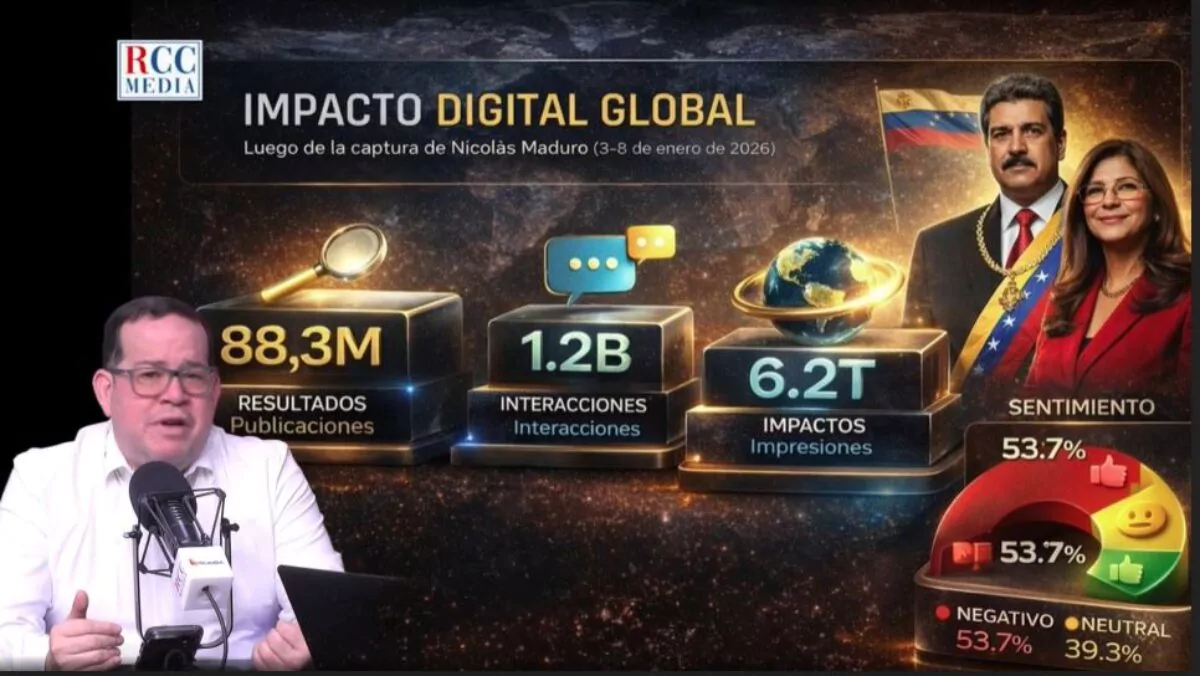 En el desglose por países, indicó que Estados Unidos encabezó la conversación con más de 31 millones de publicaciones, seguido por Colombia, España, México y Brasil. Añadió que, desde el suceso hasta ese jueves, el volumen total alcanzó los 88,3 millones de publicaciones.