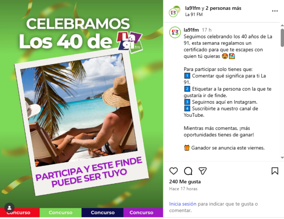 "Seguimos celebrando los 40 años de La 91, esta semana regalamos un certificado para que te escapes con quien tú quieras", señala la promoción.