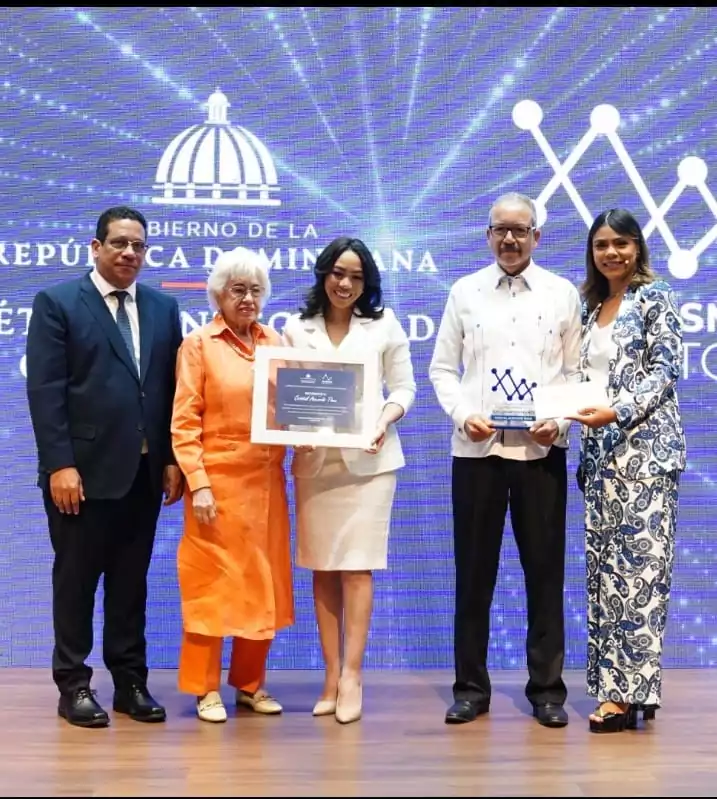 Cristal Acevedo recibe premio de manos de Milagros Ortiz Bosch, directora de la Digeig. Fuente externa