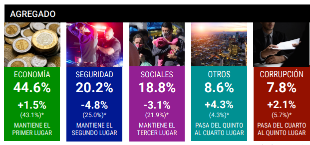 En segundo lugar, la seguridad se posiciona con un 20.2%, aunque ha disminuido en 4.8% en comparación con la encuesta anterior. Los problemas sociales ocupan el tercer lugar, con un 18.8%, mostrando una reducción de 3.1%.