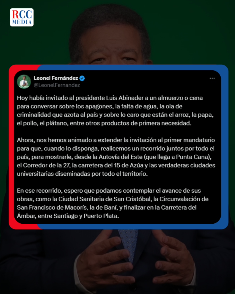 El expresidente Leonel Fernández respondió este lunes a la invitación del mandatario Luis Abinader para un almuerzo en Pedernales, extendiéndole una contraoferta para realizar un recorrido por todo el país y abordar problemáticas nacionales.