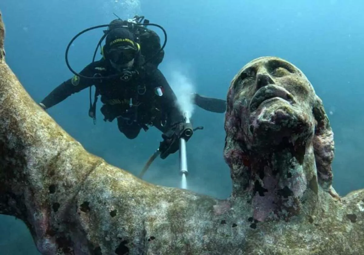 La estatua del Cristo de los Abismos, ubicada a 17 metros de profundidad en el fondo marino de la bahía de San Fruttuoso, en la costa de Liguria (norte de Italia), ha sido sometida a su limpieza anual por un equipo de buzos especializado.