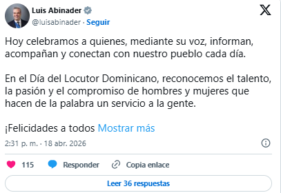 “Hoy celebramos a quienes, mediante su voz, informan, acompañan y conectan con nuestro pueblo cada día. En el Día del Locutor Dominicano, reconocemos el talento, la pasión y el compromiso de hombres y mujeres que hacen de la palabra un servicio a la gente”, expresó.