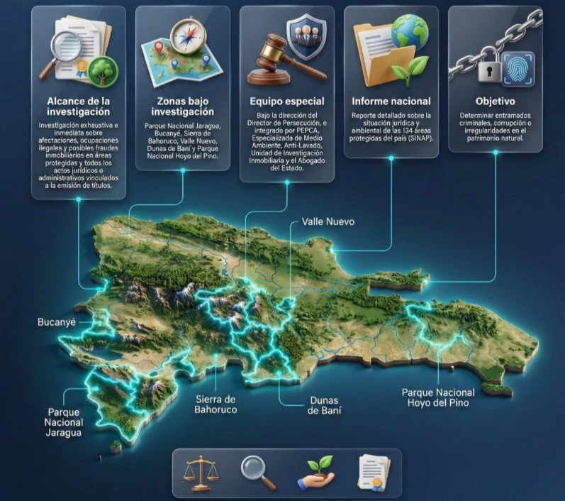 La procuradora general de la República, Yeni Berenice Reynoso, instruyó la realización de una investigación exhaustiva e inmediata sobre presuntas ocupaciones ilegales, afectaciones ambientales y posibles fraudes inmobiliarios en diversas áreas protegidas del país, entre ellas el Parque Nacional Jaragua, Bucanyé, Valle Nuevo, las Dunas de Baní, la Sierra de Bahoruco y el Parque Nacional Hoyo del Pino.