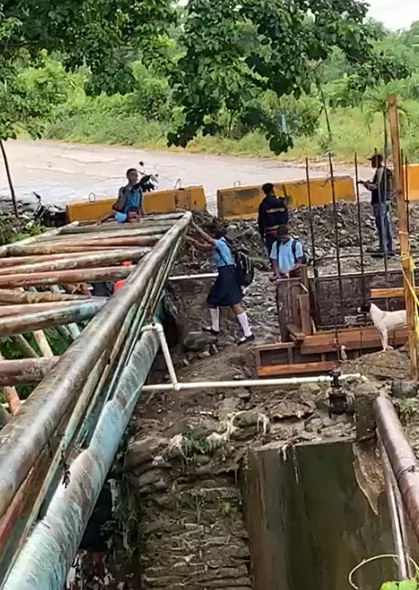 Decenas de niños residentes en el distrito municipal de La Guáyiga y en el Residencial Mi Vivienda ubicado en la carretera Hato Nuevo, municipio Pedro Brand, arriesgan su vida diariamente al atravesar un puente en construcción sobre el río Lebrón para poder asistir a clases.