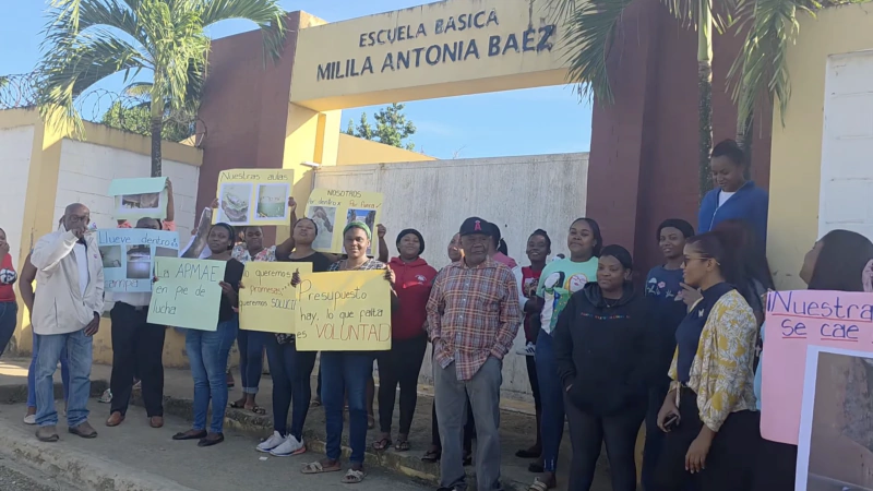 Padres, madres y docentes de la escuela básica Milila Antonio Báez mantienen un paro indefinido de docencia en Pedro Brand, en protesta por el grave deterioro de la infraestructura del plantel, que consideran un riesgo para la vida y la salud de los estudiantes.